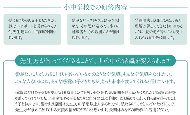 教育関係者の方には、ヘアロス当事者や親御さんがいらしたら、私達当事者団体に繋げていただきたき、先生方には周囲の子ども達のヘアロスに対する認知の変化や拡大にご協力いただきたいと思っております。