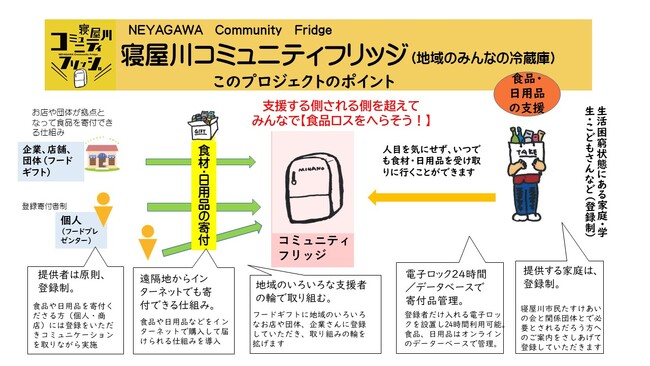 寝屋川コミュニティフリッジは、特定非営利活動法人寝屋川市民たすけあいの会が、2021年10月29日に開設した食料品・日用品の支援を必要とされる方(ひとり親家庭とそのこどもさんなど)が、時間や人目を気にせず、24時間都合が良い時に提供される食料品・日用品を取りに行ける仕組みです。