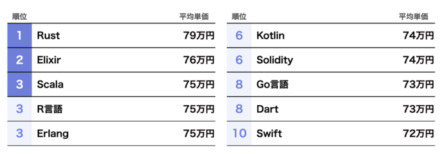 ■フリーランスエンジニアのプログラミング言語別単価トップは「Rust」