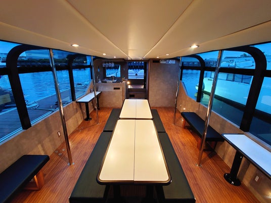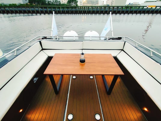 ヴェネツィアのウォータータクシーとリムジン(操縦席と客室が隔離されたプライベート空間)を掛け合わせたような唯一無⼆の完全オリジナルリバークルーズ船は、室内はまるでホテルのラウンジのようなインテリアデザイン、そして、後部のオープンデッキでは、いつもと違う景色を風を感じながら楽しめ、その解放感は最高です。通気性も良く、広々とした船内に、限られた特別なお客様をワンランク上のリバークルーズへご案内します。