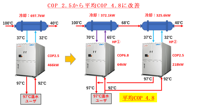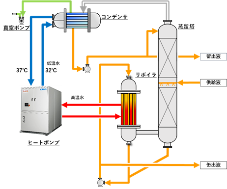 本システムは、これまでヒートポンプの採用が困難とされていた、不連続でエネルギーの需給がランダムとなるケースにおいて、効率よく熱を回収することが可能です。地球温暖化対策の観点から化石燃料由来のボイラ蒸気をゼロにして、原子力又は再生可能エネルギー由来の電力に置き換えることによりCO2排出ゼロが達成できると考えております。本システムでは、シミュレーションプログラムも開発し、長年当社が蒸発・蒸留装置の省エネ化で培ったノウハウが最大限盛り込まれています。