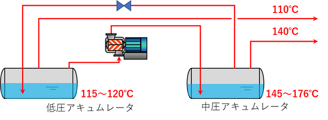 低圧アキュムレータと中圧アキュムレータを蒸気圧縮機で連結することにより、直列に配置しています。低圧蒸気がより有効に使用できるように中圧アキュムレータから低圧アキュムレータへ蒸気を送れるラインを設けています。
