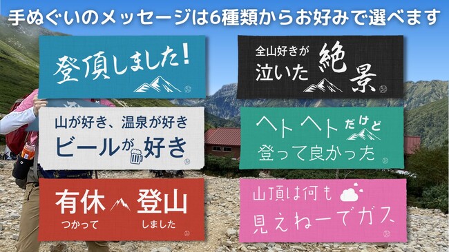 ・山登りの記念撮影などに!ココロの叫びをメッセージ手ぬぐいで伝えて、思い出をもっと豊かに