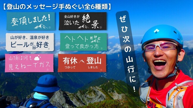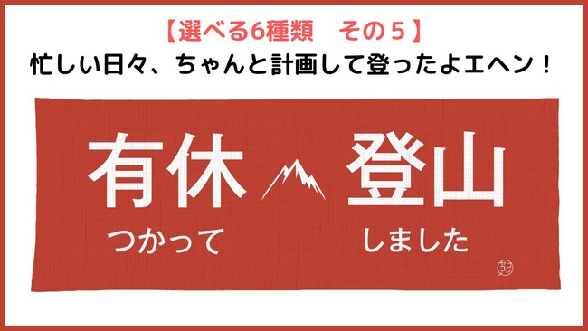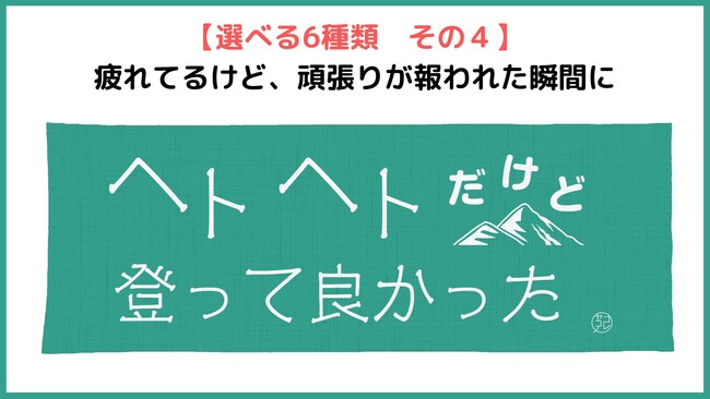 それでは、登山のよろこびや苦労の思いを込めた、6種類のメッセージ手ぬぐいをご紹介してまいります。