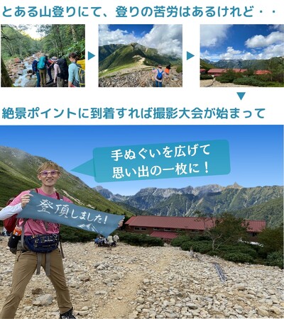 などなど、山好きなら誰もが抱いたことがあるような思いを、このメッセージ手ぬぐいを掲げて記念撮影して、発信してみませんか。