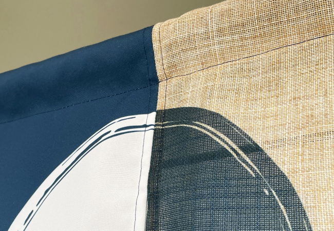 のれんは通常1種類の生地で製作をしますが、麻MIXのれんは割れの1つに麻生地を使い2種類の生地で製作します。デザインとして1割れだけ色を変えたり、柄を付けたりすることはありますが、生地そのものを変えているので、デザインだけでは出せない風合いを表現することが出来ます。生地をデザインの要素として使用することで、デザインに奥行きを出すことが出来ます。また、一部分だけに麻生地が使われているのれんは見た目も珍しく、誘目性も高まり、広告塔として認知度を高めてくれます。
