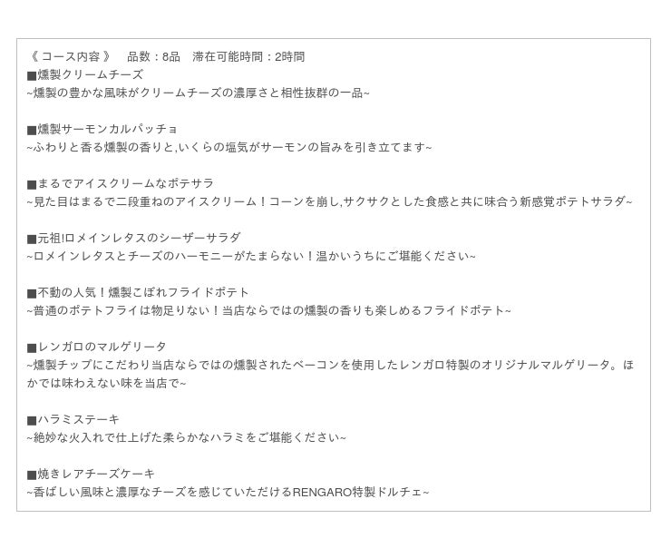コース名である『Merrily(メリリー)』にちなみ、楽しく当店の料理を楽しんでいただけるようRENGAROの人気メニューを詰め込みました。