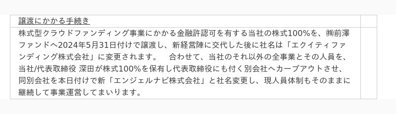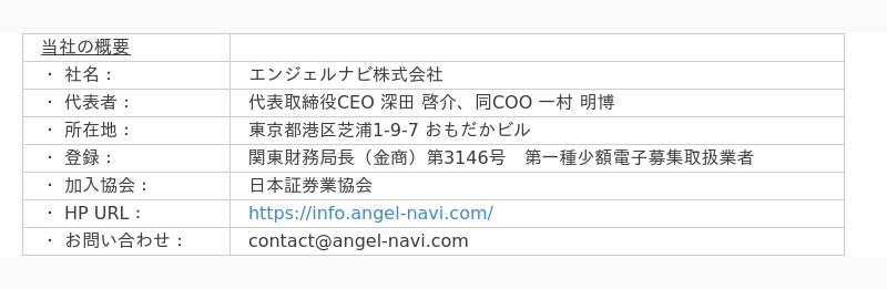 エンジェルナビ株式会社(東京都港区、代表取締役:深田啓介、以下「当社」)は、運営する株式型クラウドファンディング事業(「AngelNavi」)を、(株)前澤ファンド(東京都港区、代表取締役:前澤友作)へ完全譲渡いたしましたこと、お知らせいたします。 尚、今般の譲渡(譲渡価額:非開示)は、当社グループにおけるこれまでの自己投資(30件弱)の中で過去最大のリターン実績となり、結果、全投資平均のネットマルチプルは3.3倍、と国内VC業界の一般的な平均水準を上回る水準となっております。 当社は、2021年9月にインターネット金融大手のSBIグループより、当社の前身であるSBIエクイティクラウド株式会社の株式100%を買収し、株式型クラウドファンディング事業に参入いたしました。その後、経営陣を現メンバーに刷新し、抜本的な事業構造の見直しから新規事業の展開等、PMI(Post-Merger-Integration)とグロース戦略を両建てでスピーディーに推進してきたため、大幅なバリューアップを実現できました。