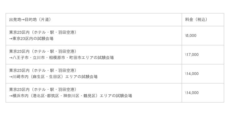 東京23区内(ホテル・駅・羽田空港)から東京23区内の試験会場までなら、片道¥8,000。東京区内(ホテル・駅・羽田空港)から横浜市内(港北区、都筑区、神奈川区、鶴見区)エリアの試験会場までは、片道¥14,000となっております。その他八王子市や立川市、川崎市などのエリアも対応しておりますので、まずは一度たびの足へご相談ください。