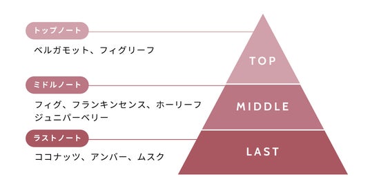 ほろ苦いグリーンを感じさせるシトラスグリーンのトップ。ミドルは芳醇なフィグとミルキーなフランキンセンスのまったりとした香りに、渋みやウッド感もプラス。ラストは甘さを残しつつ、ムスクがジェンダーレスに香ります。