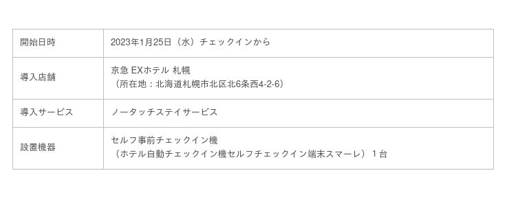 株式会社京急イーエックスイン(注1)(以下、京急イーエックスイン)は、ニューノーマル時代に求められる非対面・非接触による高い安全性の確保と、ワーケーション需要の拡大などを背景にスマートでスピーディーなチェックイン・チェックアウトによる利便性のさらなる向上を可能にする富士通Japan株式会社(注2)(以下、富士通Japan)の「FUJITSU Enterprise Application GLOVIA smart(グロービアスマート) ホテルSaaS ノータッチステイサービスオプション」(以下、ノータッチステイサービス)を中核とした新レセプションサービスを、1月25日から「京急 EXホテル 札幌」において運用開始します。