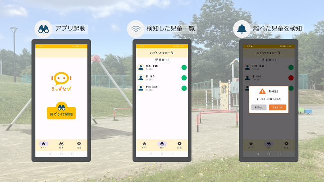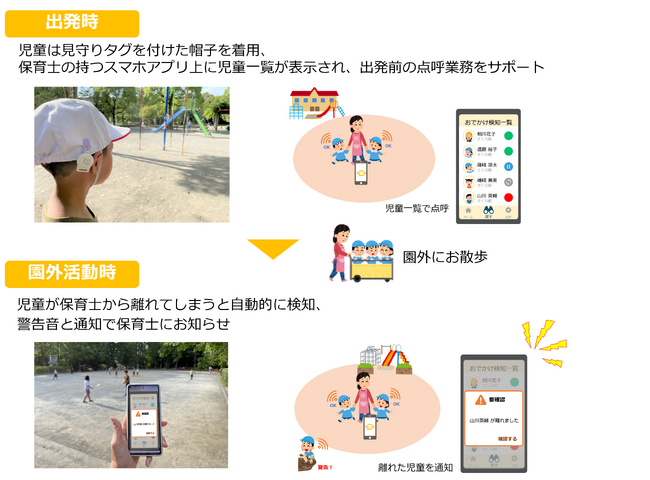 新たなオプション機能では、保育士が携行するスマートフォンに専用アプリをインストールしておくと、見守りタグを検知。保育士は事前に検知範囲の距離を指定することで、児童がその距離を超えて保育士のいる位置から離れた際に、自動的にスマホに警報音と通知を出します。通知には、離れた児童の名前もわかります。見落としを防ぐだけでなく、人数確認など点呼にかかる手間と時間を軽減します。