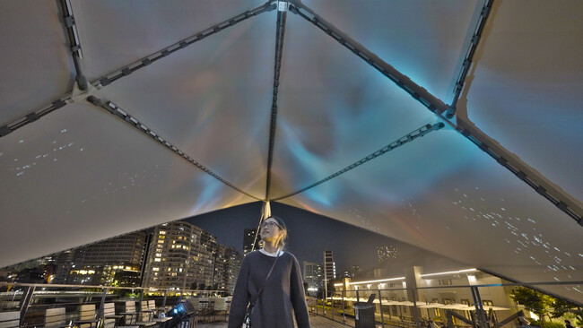 上昇した泡は、船を動かす気流のプロジェクションマッピングとして、屋上のテントに投影。江崎氏らによる演奏と観客が変化させた音が混ざり合い、幻想的な映像となって映し出されます。