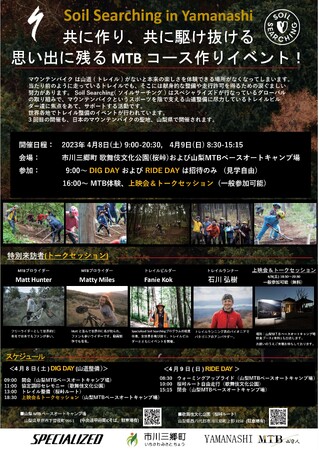 4/8(土),4/9(日)の2日間でスペシャライズド社のグローバルイベント『Soil Searching in Yamanashi』を山梨MTBベースオートキャンプ場にて開催し、2日間で約200名が参加。その中で、山梨県市川三郷町とYAMANASHI MTB 山守人(一般社団法人南アルプス山守人)は山林空間の活用を目的とした『地域活性化包括連携協定』を締結。