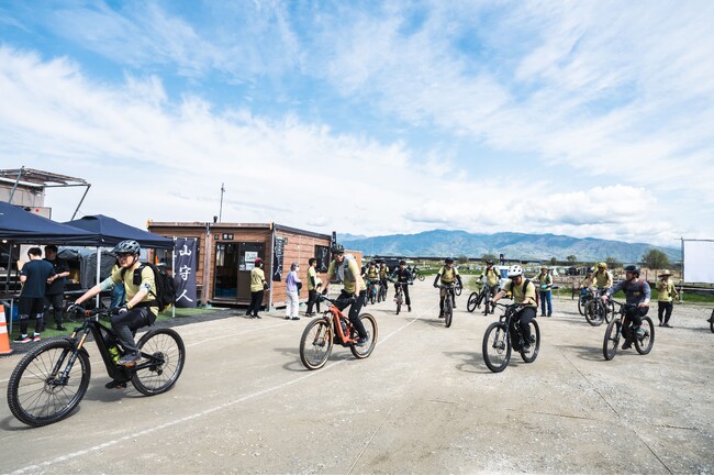YAMANASHI MTB 山守人の会員メンバーが先導し、参加者がE-MTBで出発。