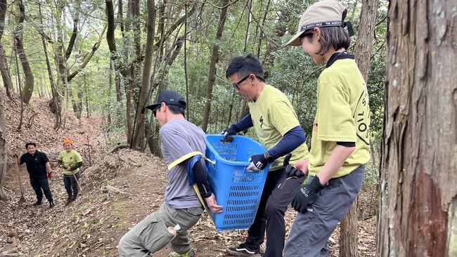 土壌侵食の進む箇所の修繕は、市川三郷町役場の皆さんも含む参加者全員で重い石を運んだ。