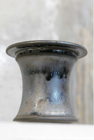 作品は、自然豊かな地で土と金属、そして炎との化学反応の研鑽により生み出され、それぞれの反応による変化を活かした独特なテクスチャーが特徴。