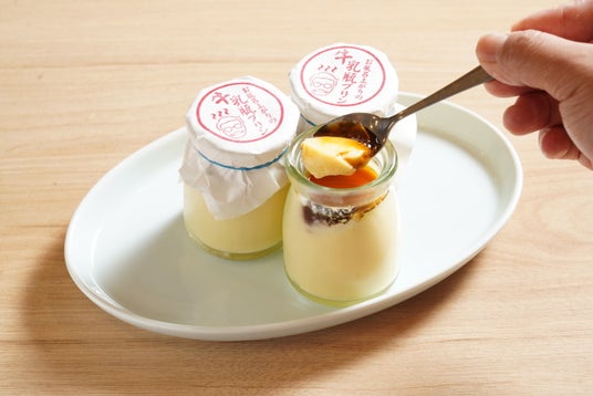 銭湯をイメージした牛乳瓶プリンはテルマエオリジナルロゴ入り。