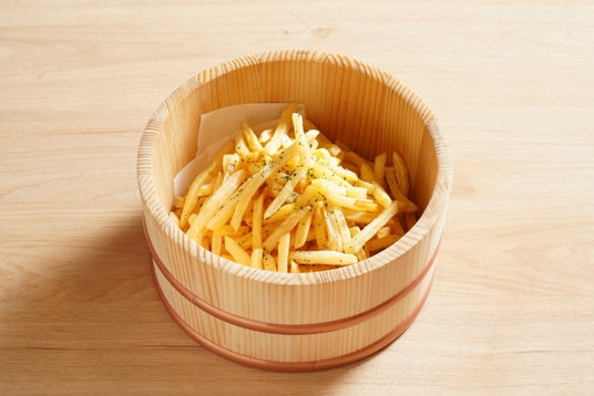 3人前以上のご注文で木桶で提供するシャカポテトフライ。