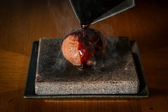 溶岩焼き生ハンバーグ。熱々に熱した溶岩の上でお好みの焼き加減でお召し上がりいただく。