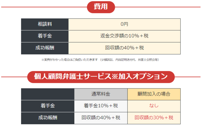 また成功報酬も、通常は「回収金額の40%+税」のところ、個人顧問弁護士サービス加入の場合は「回収金額の30%+税」に割引をさせていただきます。