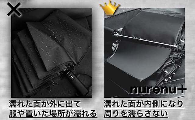 折り畳み傘を綺麗に生地を揃えて畳もうとすると早くても数十秒はかかるところをnurenu+であればクルッと一瞬で畳むことが可能!