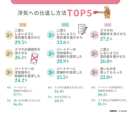 浮気への仕返し方法1位は、男性「誓約書を書かせた」で女性「スマホの連絡先を消させた」