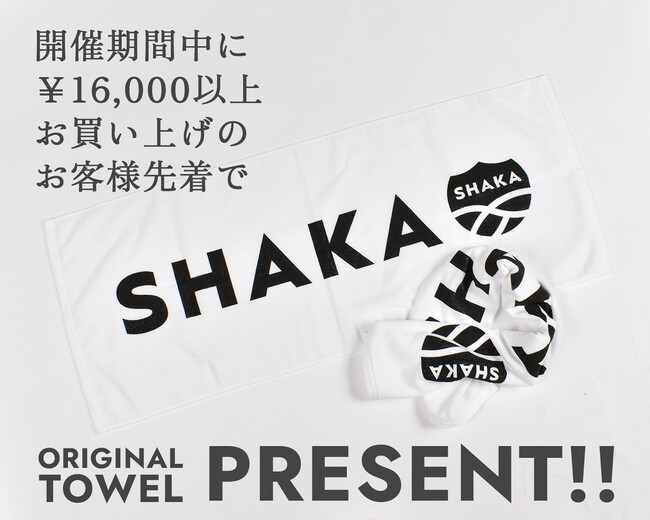 各POP-UP開催期間中に、税込¥16,000以上お買い上げいただいたお客様には、SHAKAオリジナルロゴがプリントされた【フェイスタオル】をプレゼント!!