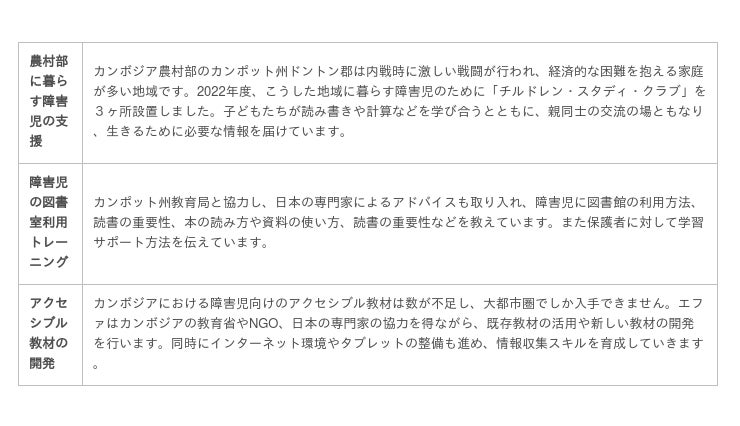 例えば、エファの活動地カンボジアでは過去30年に及ぶ内戦で学校や図書館が閉鎖され、書物は焼かれました。子ども向けの本もゼロから作り直さなければならず、障害児のための教材は皆無に等しい状態です。