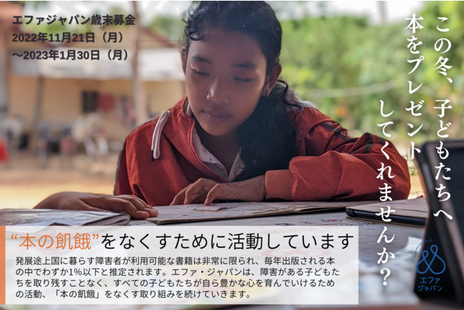 「本の飢餓」ー障害者が利用可能な書籍が限られている、世界的に深刻な状態をこう呼びます。特に発展途上国に暮らす障害者が利用できる本は、毎年出版される本のわずか1%以下と推定されます。エファジャパン(理事長 伊藤道雄/所在地 東京都千代田区、以下「エファ」)は、「本の飢餓」をなくす活動を行なっています。子どもたちへ本を届けるため、歳末募金キャンペーンへご支援をよろしくお願いいたします。