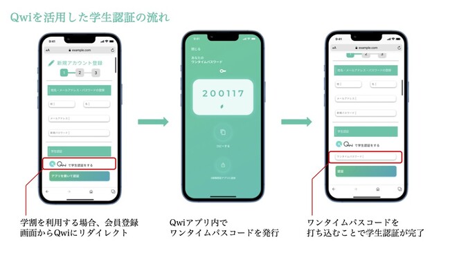 「Qwi App」は、弊社の独自の認証システムによって行う「学生認証」や学生個々人が興味を持つカテゴリーのサービスを検索することが可能なアプリケーション(以下、アプリ)です。このアプリでは、プロモーション利用時に店舗で2次元コード提示(ワンタイム表示)できる他、連携しているサービスのオンライン認証に必要な「ワンタイムパスワード」を取得することができるなどの機能があります。