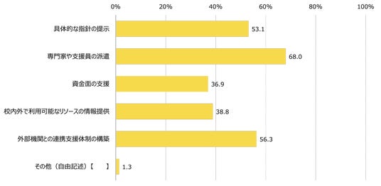 教員が求める支援として「専門家や支援員の派遣」(68.0%)、「外部機関との連携支援体制の構築」(56.3%)、「教員向け研修の充実」(50.1%)が挙げられました。現場の負担を軽減し、適切な支援につなげるために、役割分担と連携体制の整備が求められています。