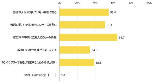 ヤングケアラーの把握が難しい理由として、「家庭内の事情に立ち入ることへの躊躇」(64.7%)が最多で、次いで「生徒本人の自覚の欠如」(55.0%)と「普段の関わりではわからないことが多い」(51.1%)が挙げられました。プライバシーへの配慮や家庭環境への関与の難しさに加え、日常的な学校生活では気づきにくいことが課題となっています。