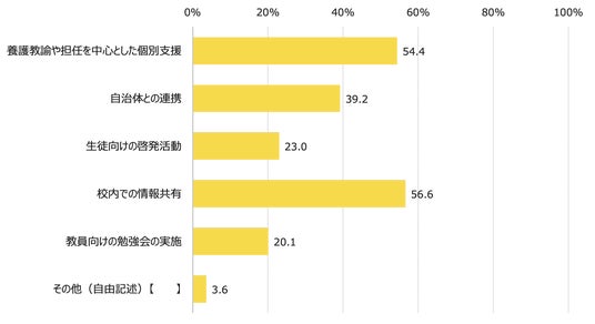 学校内での支援策として、「校内での情報共有」(56.6%)や「個別支援」(54.4%)が中心となっています。校内で一定程度支援が行われているものの、「自治体との連携」は39.2%にとどまり、学校と外部機関の協力体制の強化が求められています。