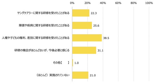 - 教員向け研修の充実ヤングケアラーに関する研修を受けた教員は少なく、学校現場での支援方法を学ぶ機会が限られています。教員が必要な知識とスキルを習得できる研修の充実が望まれています。