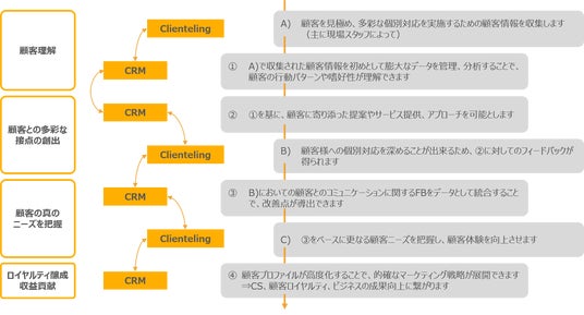 スマートウィルは、自社が開発するCRMシステム「BoCRM」の基本機能である顧客データの「収集・管理・分析・活用」の4ステップに、「クライアンテリング」機能を追加しました。これにより、顧客情報を深く集め、気付きを導出する分析を行うことで、コミュニケーションすべき対象顧客や、コミュニケーションすべき内容が最適化され、顧客満足度が上がり、企業・ブランドへのエンゲージメントが高まり、収益貢献に繋がります。