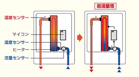給水側だけではなく、給湯側にも温度センサーを設けることで、誤差をさらに補正し、給湯温度の安定を実現しました。