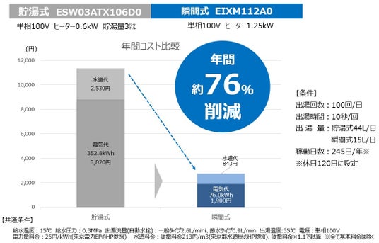 日本イトミックが製造する超小型電気瞬間湯沸器は、つらい冬場の手洗いも快適にしながら、従来型の電気温水器とは違い、お湯にするのに必要な電力以外使わない瞬間加温式です。両社の強みを生かし省エネも実現。従来型の電気温水器に比べランニングコストは76%削減いたしました。