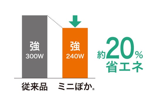 ※消費電力:従来品(強300W) ミニぽか(R)(強240W)