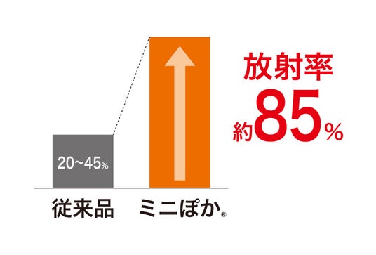 動物が効率的に暖を取れる熱源の放射率は約85%と従来品よりも高く、同じ電力消費でより多くの熱を放射するため、動物が効率的に暖を取れます。