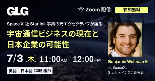グローバル・インサイト・ネットワークである、株式会社 Gerson Lehrman Group(以下、GLG、本社所在地:東京都港区、代表取締役社長:橋本勇人)は「宇宙通信ビジネスの現在と日本企業の可能性」をテーマに、SpaceX社 Starlink事業の元インフラ責任者であるBenjamin Weltman氏をスピーカーに迎えた無料ウェビナーを、7月3日(木)午前11時に開催いたします。