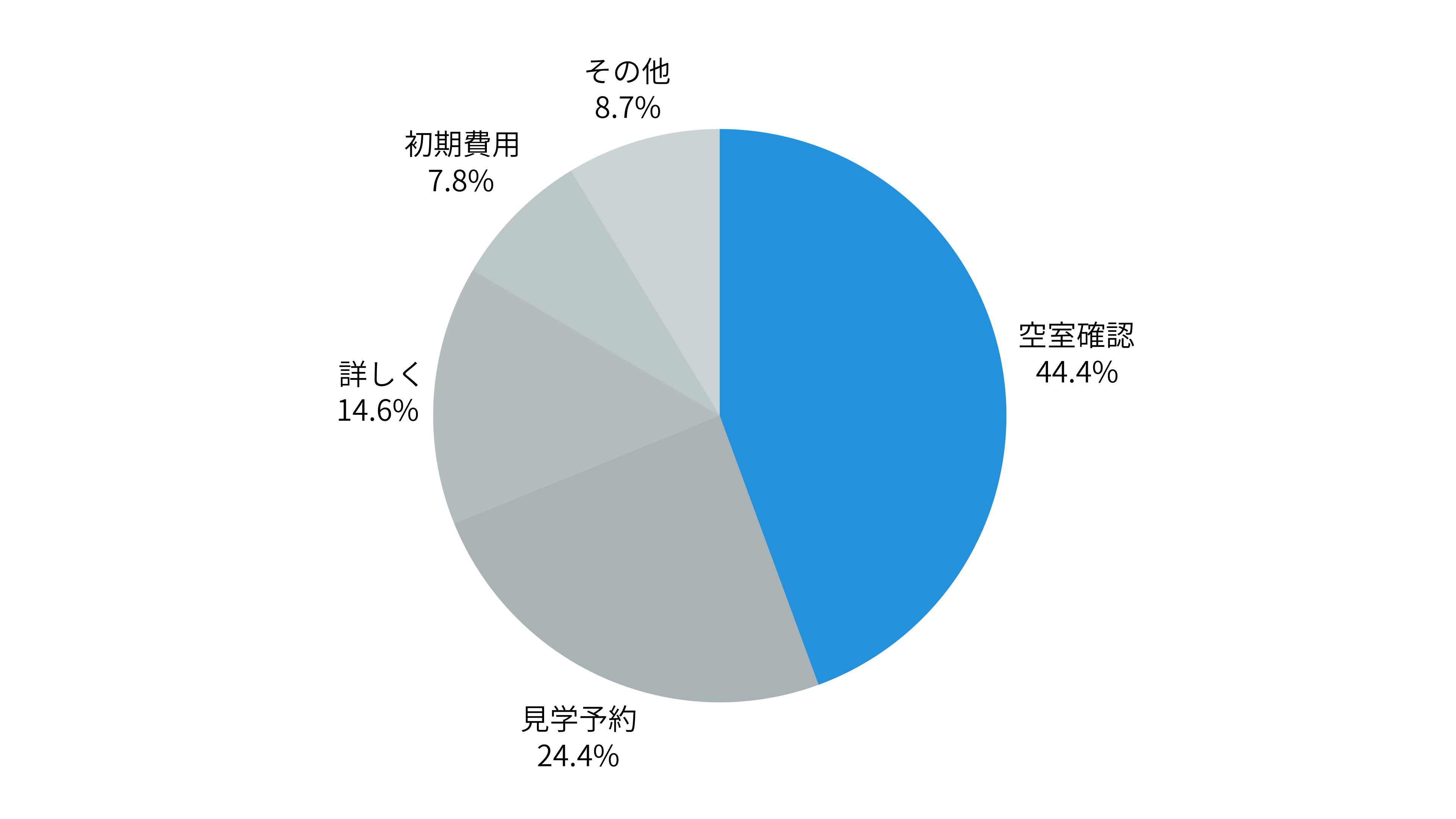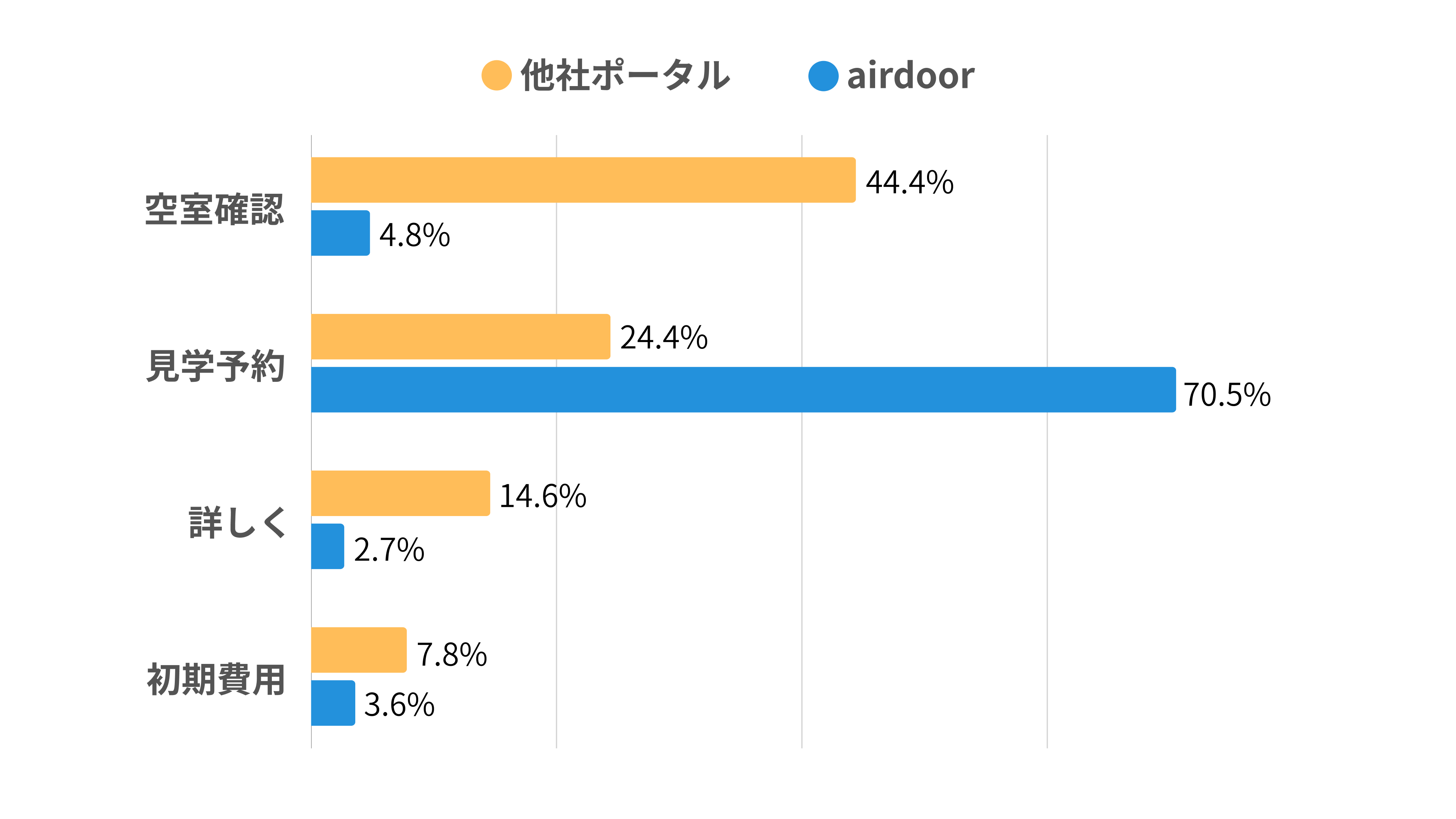 問い合わせの種別を比較すると、他媒体では最も多い問い合わせ内容が「空室確認」(44%)であるのに対し、 エアドアでは「見学予約」が70%以上を占め、最多となりました。