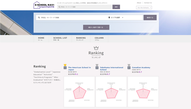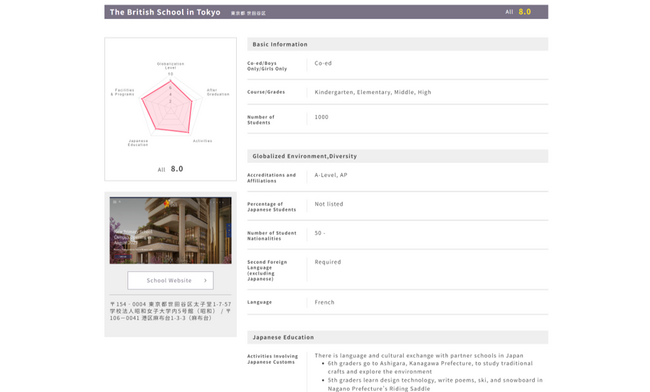比較検討しやすいよう、「グローバル度」「海外大学への進学実績」「学業以外の課外活動」「施設」「日本語教育」などへの取り組みを評価し、スコアをチャート化することで、各校の違いを分かりやすく示しています。