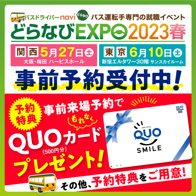 バス運転手専門の求人サイト『バスドライバーnavi(どらなび)』を運営するリッツMC株式会社(本社:東京都港区、代表:中嶋 美恵)は、5月27日(土)に大阪・ハービスホールで、6月10日(土)に東京・新宿エルタワーで、バス運転手専門の就職イベント『どらなびEXPO2023春』を開催致します。