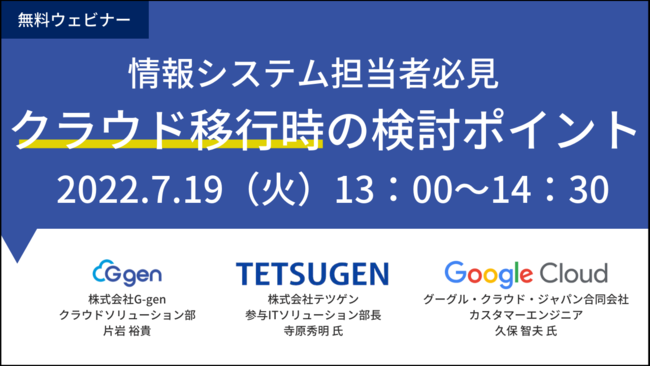 株式会社G-gen(本社:東京都新宿区、代表取締役:羽柴孝)は、株式会社テツゲン、グーグル・クラウド・ジャパン合同会社と共催で、無料ウェビナー「クラウド移行時の検討ポイント」を7/19(火)13時より実施いたします。