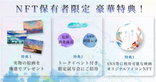 映画本編に登場する絵画の実物や、トークイベント付き限定試写会への参加権、SNSのアイコンとして利用できる映画オリジナルアイコンNFTなど、NFT保有者限定の豪華特典をご用意しています。