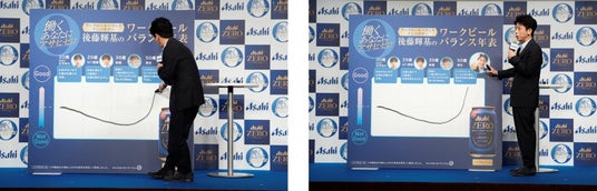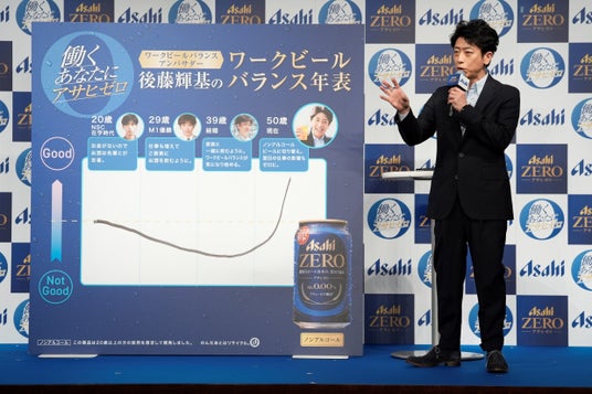 当日は、アサヒビール株式会社マーケティング本部長を務める古澤毅より、「働くあなたにアサヒゼロ プロジェクト」の概要や具体的な取り組みについて説明しました。さらに、フットボールアワーの後藤さんと経済評論家の鈴木貴博さんに登壇いただき、プロジェクトに関するトークセッションを行ったほか、後藤さんがご自身の「仕事」と「ビール」のバランスの変化を人生の節目ごとに振り返る「ワークビールバランス年表」を実施しました。発表会の最後には4月7日(月)から公開のTVCM「働くあなたにアサヒゼロ市場」篇を上映し、後藤さんがクオリティアップした『アサヒゼロ』の感想を述べました。