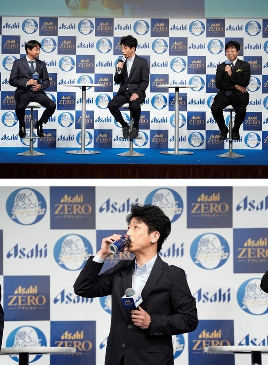 発表会の冒頭には、アサヒビール株式会社マーケティング本部長 古澤毅から、「働くあなたにアサヒゼロ プロジェクト」について紹介しました。プロジェクトの狙いについて、働くビール好きが抱える「ビールと仕事のバランス」に関する調査をもとに発表。「約2人に1人の方々がビール類を飲みたいけれど、翌日の仕事のことを考えて飲むのを控えることがある」という調査結果に対し「ビール好きの働く人たちに本格的な味わいが特徴の『アサヒゼロ』を生活に取り入れてもらうことで、無理なく、ポジティブに「仕事」と「ビールを楽しむ時間」をうまく両立させ、充実させてもらう『ワークビールバランス』を目指す」とコメント。また、賛同企業との企業コラボについては「本日時点で、32社の企業にプロジェクトに賛同いただいており、2026年末までに100社での出張イベント実施に取組みます。また、働く人たち100万人に『アサヒゼロ』のサンプリングを行う予定です」と説明した上で、「2030年には『働くあなたにアサヒゼロ プロジェクト』として、500社での展開を目指します」と今後の展望を語りました。