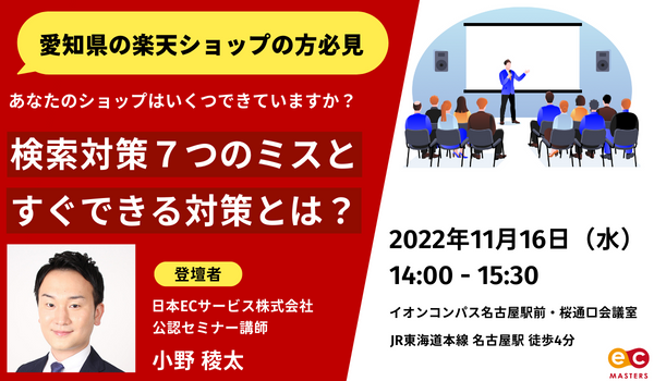 日本ECサービス株式会社(本社:東京都渋谷区、代表取締役:清水将平)は、楽天ショップにて、広告などを活用する前に対策しなければいけない7つミスをテーマに、2022年11月16日(水)に名古屋にてセミナーを開催します。
