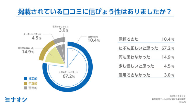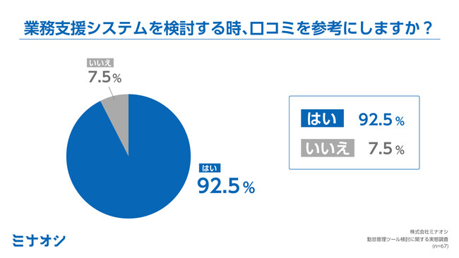 BtoBツール評価プラットフォーム「ミナオシ」を運営する株式会社ミナオシ(所在地:東京都目黒区、代表取締役:寺倉大史)は、企業のバックオフィス管理部門67名を対象に、勤怠管理システムをはじめとする業務支援システム導入時の口コミの影響や参考とする口コミの共通点について調査しましたので、その結果をお知らせします。